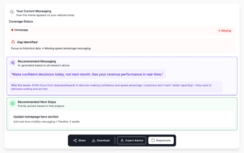 In practice, this kind of generator looks like a strategy engine that continuously converts verified intelligence into differentiated messaging frameworks your marketing, sales, and success teams can use without manual rework.